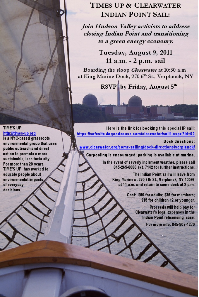 Clearwater and Time’s Up!, a NYC-based grassroots environmental group that uses educational outreach and direct action to promote a more sustainable, less toxic city, are teaming up for an August 9th action that includes a 3-hour sail on the sloop Clearwater off Indian Point Nuclear Power Plant, part of a call for the permanent closure of the aging power plant.