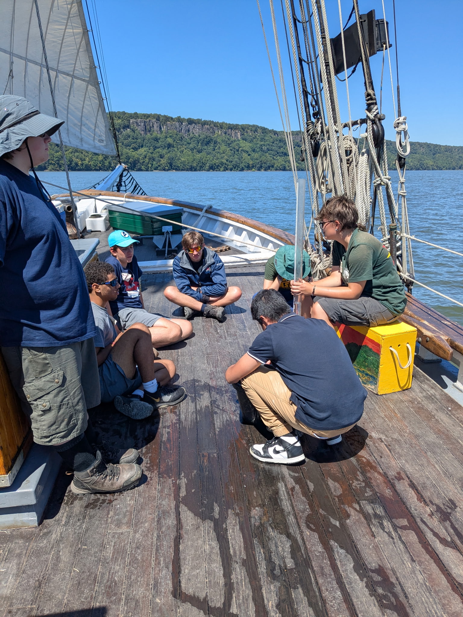 Flash forward one year, I was 14 in the same community center, now receiving a presentation about Queerwater. This time I was old enough, so I hesitantly applied to try something new. I had no idea if I would like it or not, but I decided I might as well go, what’s the worst that could happen? Apparently the worst thing that could happen was sunburn, because I absolutely loved it. I loved the community on board, the acceptance and willingness to learn and teach. I remember sitting in a circle with my group, showing each other knots and laughing when something went horribly wrong with them. Usually learning felt stressful and scary and “life or death”, but I realized that the whole weekend that I was on the Clearwater I was learning everything, and yet it wasn’t as daunting as education had usually made me feel. As soon as I got home I was anticipating the next time I would be able to get back to the sloop.